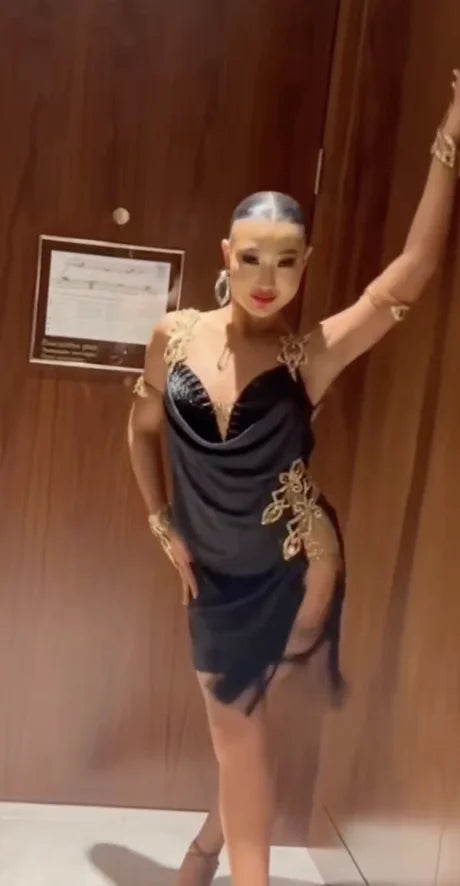 This elegant women's dance dress is made from high-quality satin enriched with stunning black and gold embellishments, featuring a fringe hem that enhances movement and flair during performances. Its hand-made construction ensures uniqueness, while the material's luxurious feel and professional fit make it ideal for Latin dance occasions, requiring careful handling to maintain its exquisite charm.