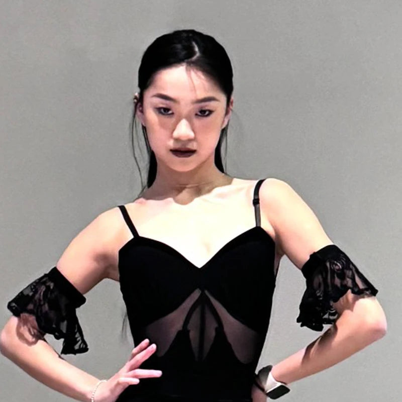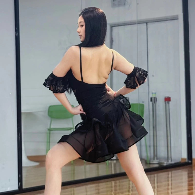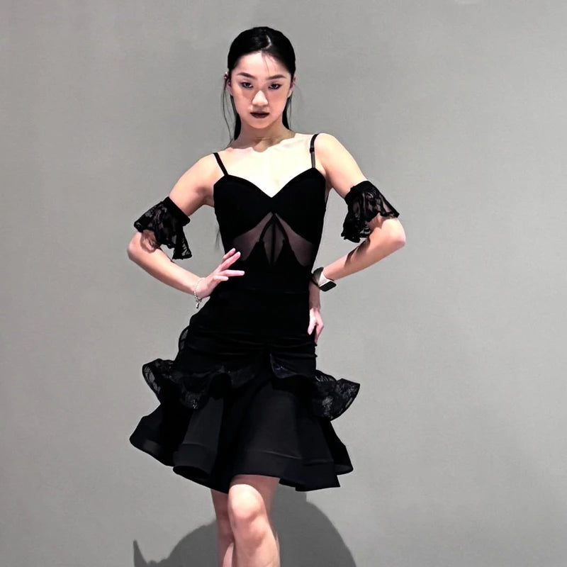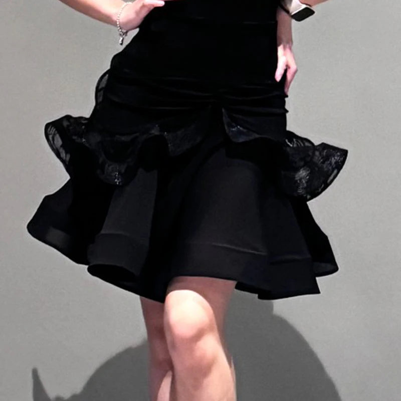 Experience elegant movement with this black mesh salsa dance dress, designed with ruffled layers for fluidity and enhanced rhythm on the dance floor. Its breathable and stretchable material ensures comfort and ease during lively performances, making it perfect for Latin dance enthusiasts.