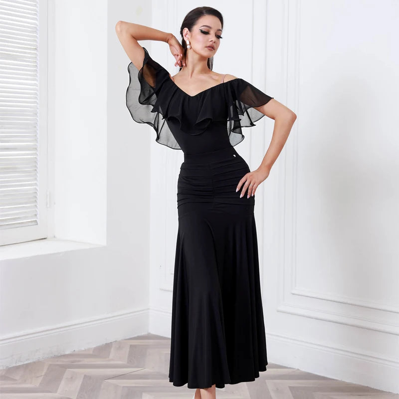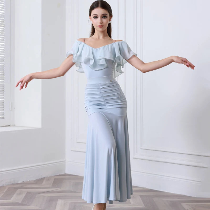 This elegant off-shoulder ruffled ruched ballroom dance dress is crafted from a lightweight fabric, offering gentle stretch and breathable comfort. Ideal for dance events or formal occasions, its versatile design ensures a flattering fit while being easy to care for.