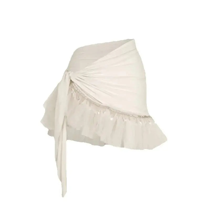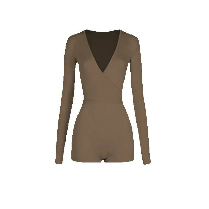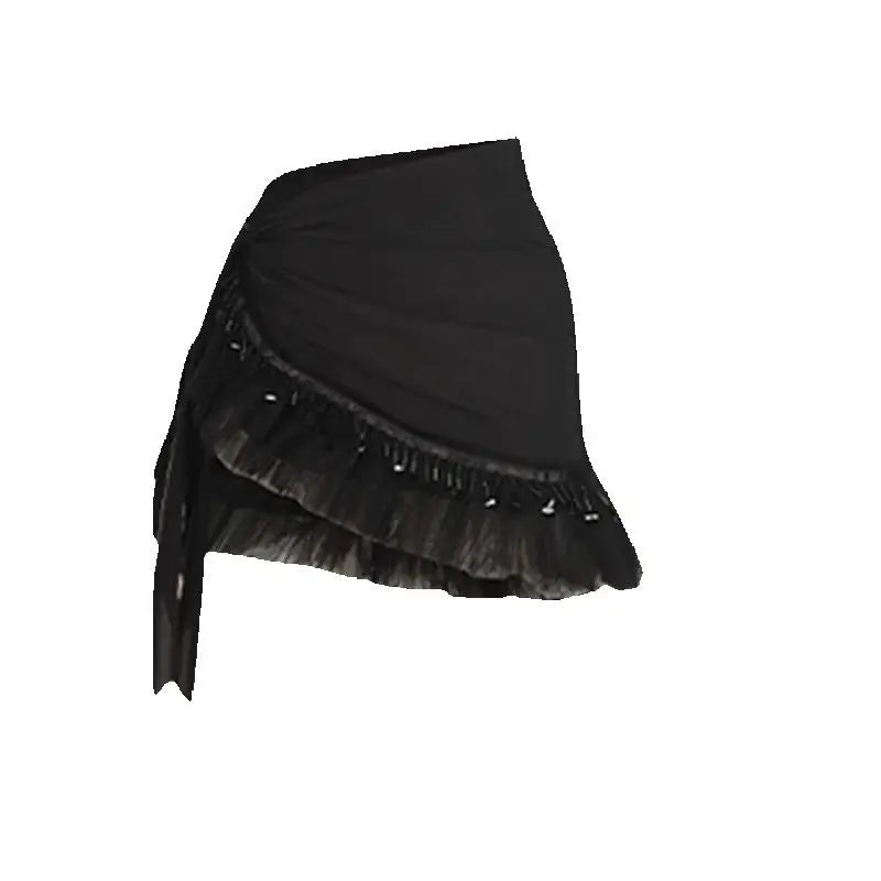 This elegant long sleeve V-neck wrap bodysuit features a ruffled tulle and satin tie skirt, ideal for Latin ballroom dance. Crafted from a comfortable fabric blend, it offers both allure and flexibility, ensuring ease of movement and style on the dance floor.