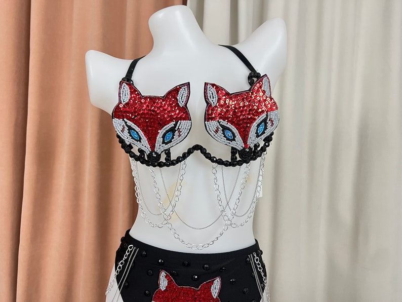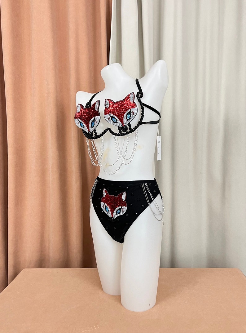 This chic sequin fox halter bikini set includes a wire bra, necklace, and high panties designed for burlesque performances. Enjoy a perfect fit with tailored options, featuring sizes that accommodate US 4-10 and UK 6-12, and a stretchable fabric for comfort during dance routines.