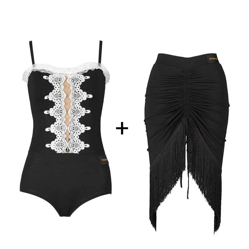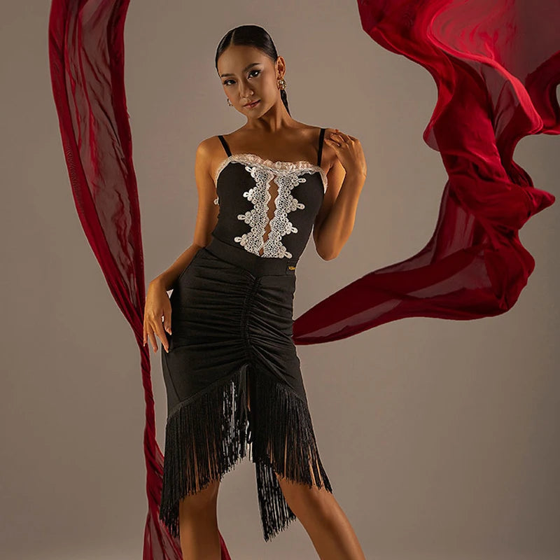 This black Latin dance skirt features an asymmetrical design with ruched detailing and fringe accents, crafted from a stretchy, comfortable material ideal for dynamic dance movements. Its flattering fit and unique style make it perfect for dance competitions and performances, offering easy care and durability.