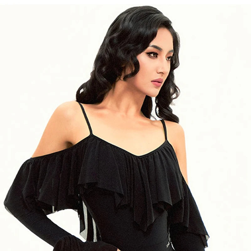 This elegant black ballroom dance dress features alluring mesh ruffles and stylish cold shoulder cutouts, perfect for enhancing your movement and grace on the dance floor. Crafted from a soft, breathable fabric, it provides a comfortable fit with slight stretch and is easy to care for, making it a great choice for practice or performance.