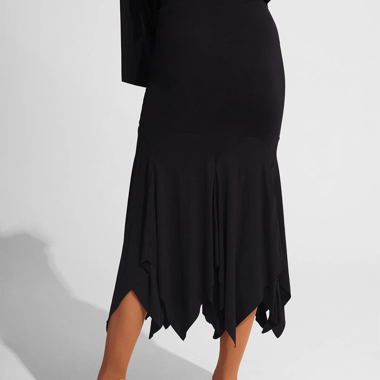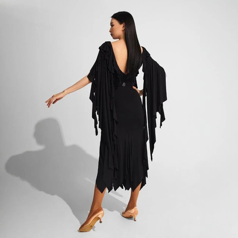This elegant black Latin dance dress features a ruffled V-neck and long sleeves, designed for ease of movement with its stretchy fabric. Ideal for ballroom dancing, it combines style with comfort, making it perfect for both rehearsals and performances.