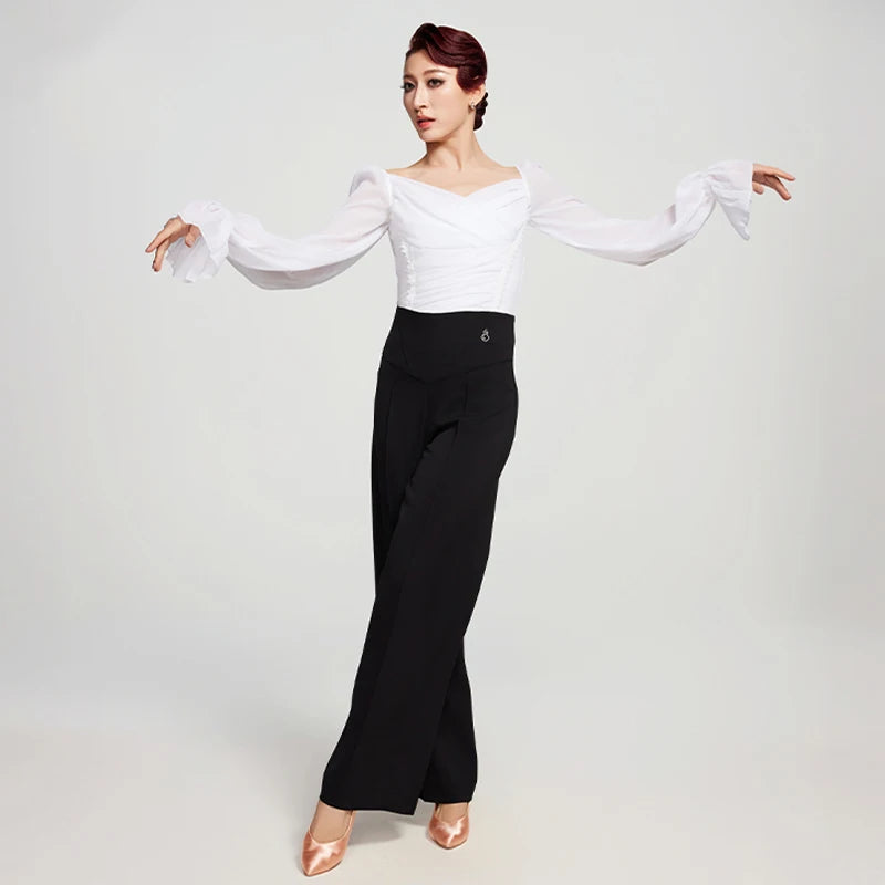Women's Black & White Chiffon & Spandex Ruffled Wide-Leg Ballroom Dance Pants & Blouse Set
