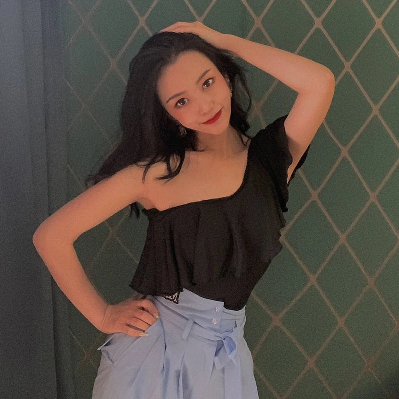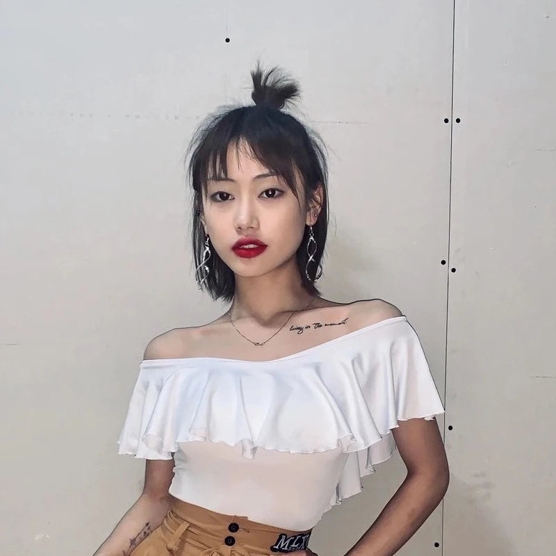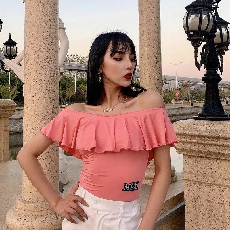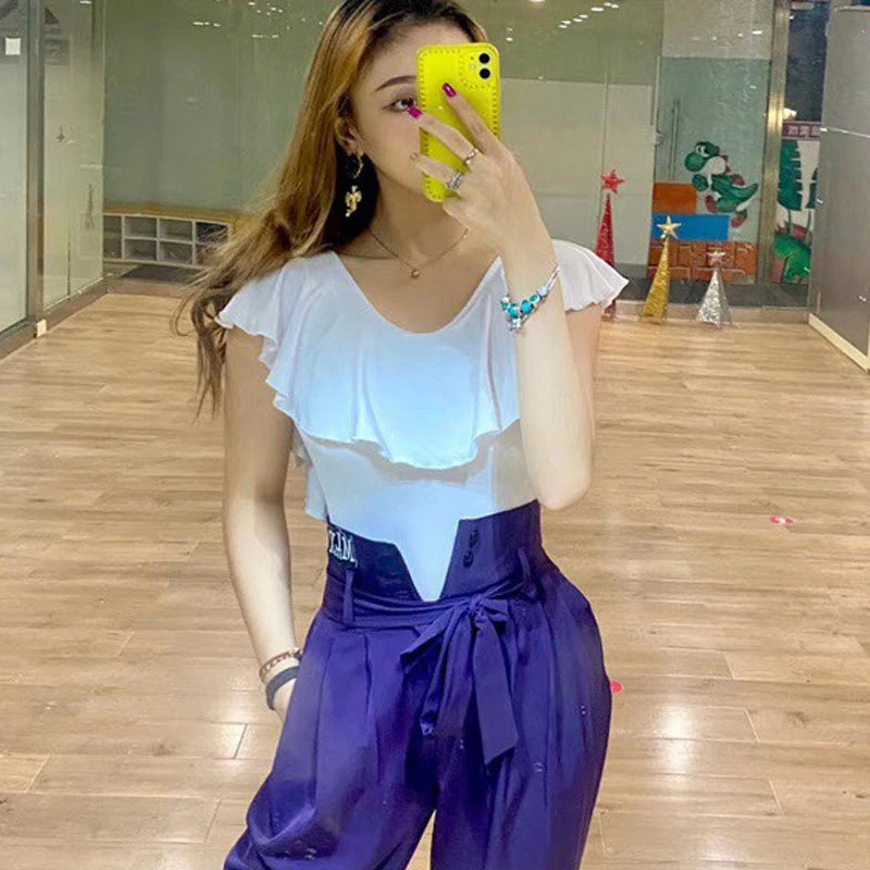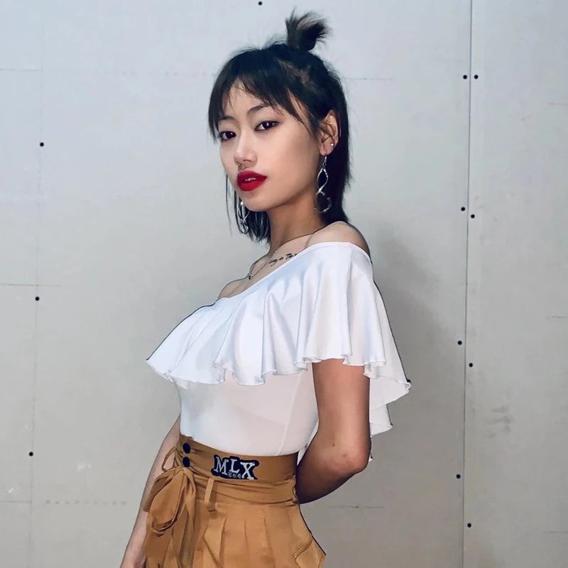 This elegant Latin dance top features a stylish off-shoulder design and black and white ruffles, with a crisscross back enhancing its chic appeal. Perfect for dance events or parties, it is crafted from a flexible fabric that's as comfortable as it is eye-catching, with easy care instructions for stress-free maintenance.