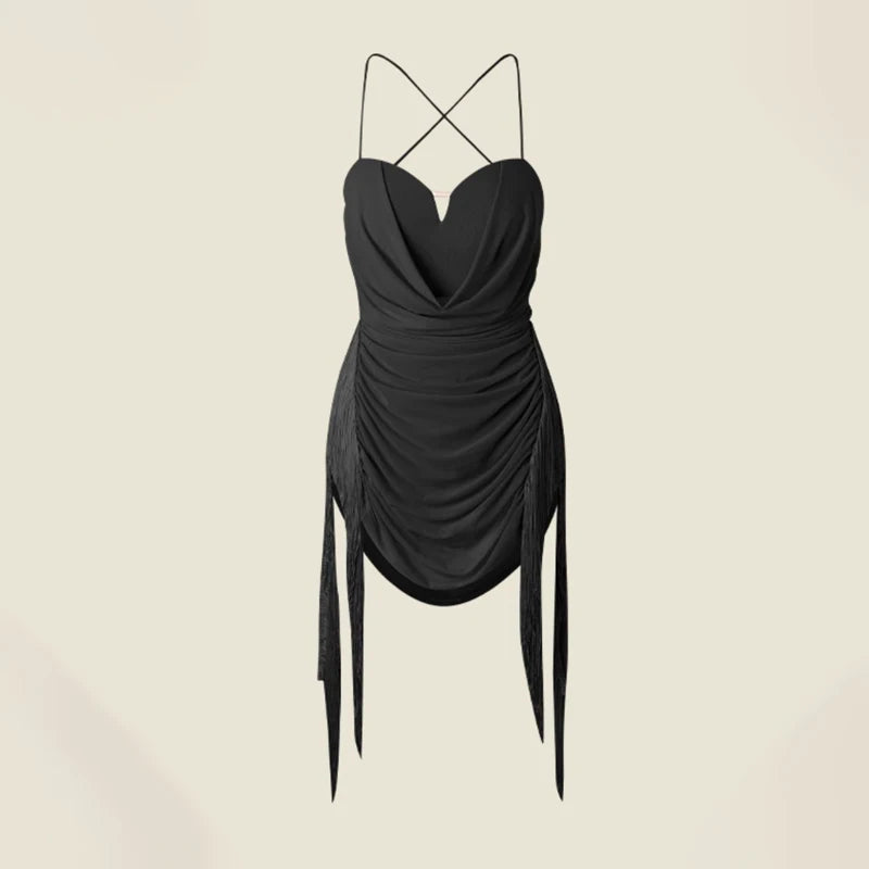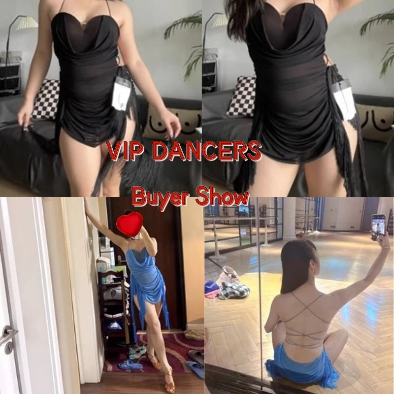 This women's blue mesh tassel fringe mini dress is designed for Latin dance, offering a flattering fit with decorative fringes for added movement. It includes a built-in bra and anti-glare pants for comfort and convenience during energetic dance performances.