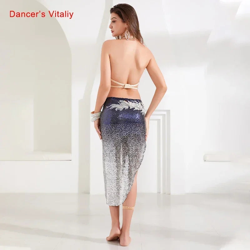 This dazzling blue and silver sequin floral skirt set features a flattering high slit, perfect for belly dancing events. Its stunning embellishments and comfortable fit elevate any performance while ensuring ease of movement.