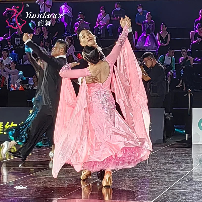 This custom-made ballroom performance dress is crafted from premium stretch fabric that drapes fluidly for elegant motion, delivering breathable comfort and confident coverage for training, competition, and stage shows. A contoured bodice and full, flowing skirt create a refined silhouette with dynamic swing, while the easy-care, travel-friendly material resists wrinkles and retains shape wash after wash.