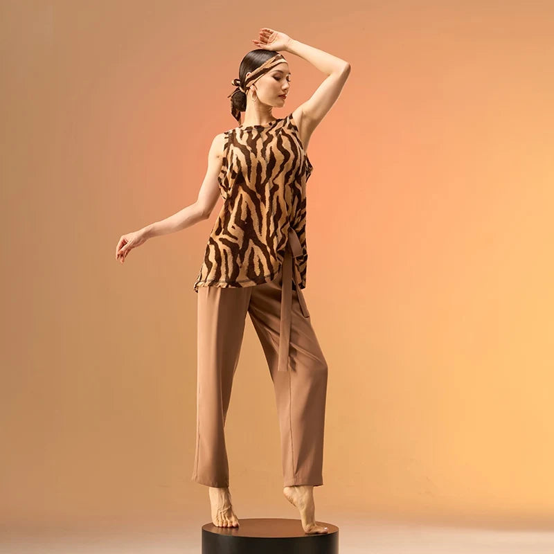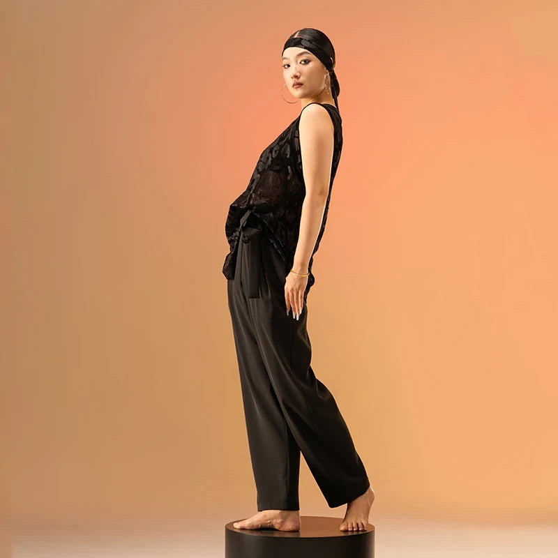 These dark mauve high-waisted pleated tapered dance pants feature a tie-waist and are designed for comfort and style, ideal for dance or casual outings. Made from a soft, stretchy fabric, they are easy to care for, offering both flexibility and a flattering fit.