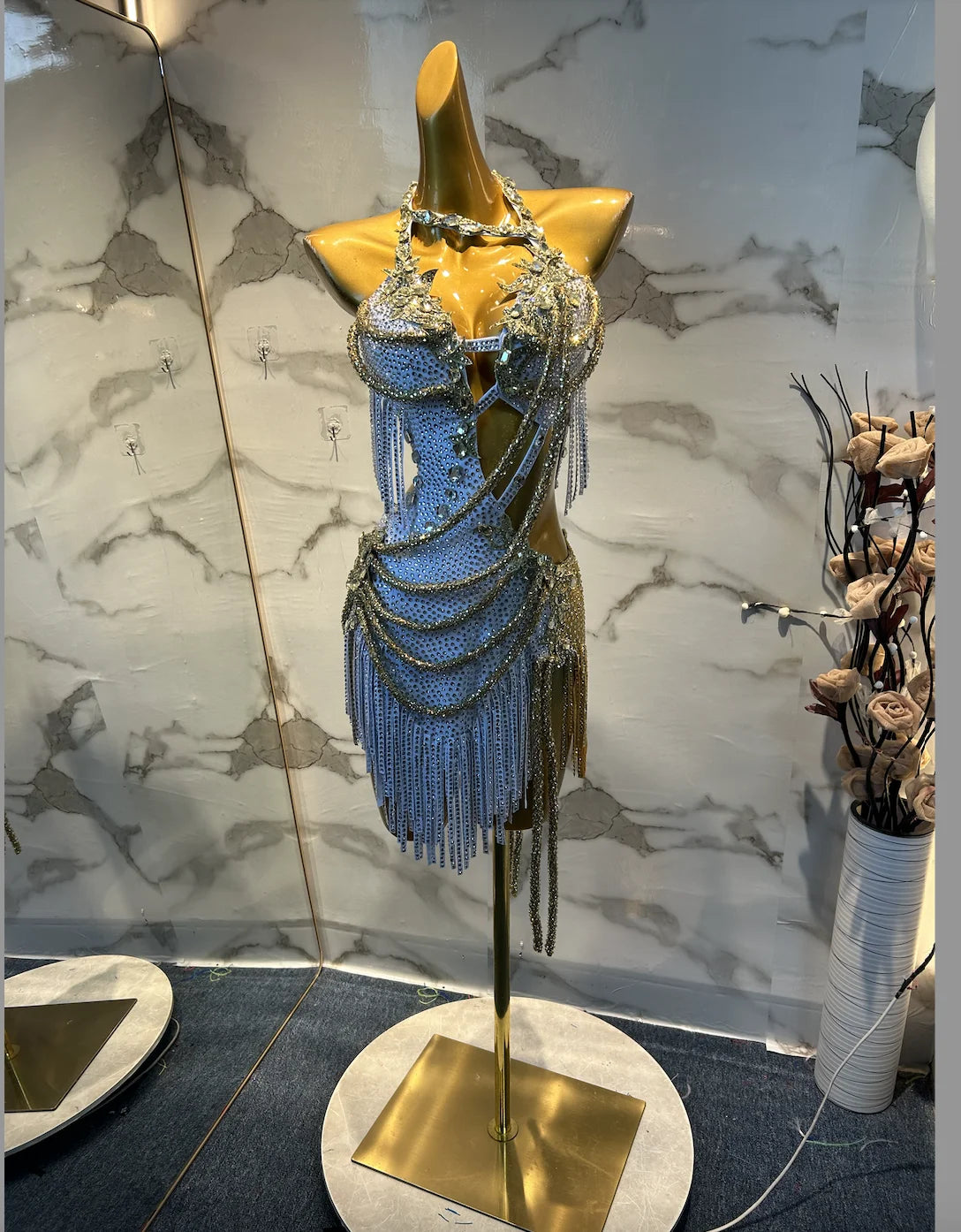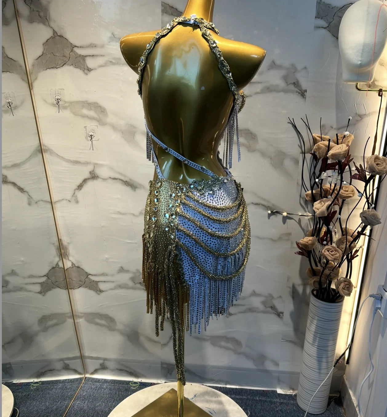 This handmade Latin dance dress features gold and white fringe sequins with elegant cutouts for a glamorous look. Ideal for dance events, its intricate design ensures a unique fit, while care requirements maintain its stunning quality.