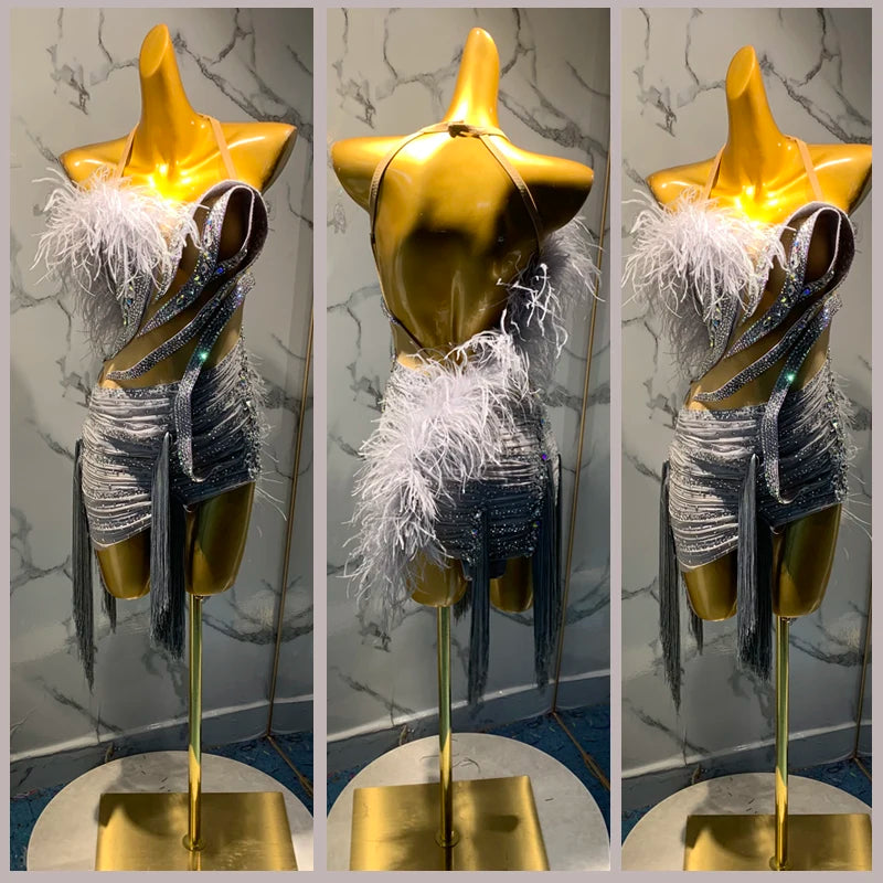 This hand-crafted gray feathered Latin dance dress is adorned with shimmering rhinestone fringes, offering a unique and stunning fit for dance competitions. With a tailored, custom fit made possible by detailed measurements, this dress provides elegance and comfort, perfect for showcasing your moves on the dance floor.