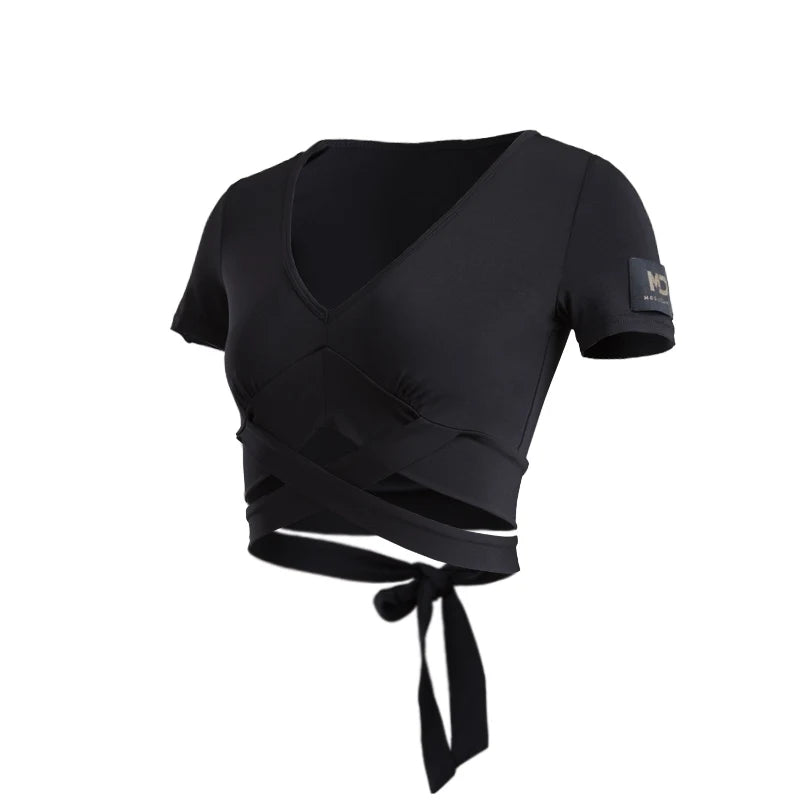 This women's gray leopard print V-neck top features a criss-cross waistband and long sleeves, perfect for Latin dance. Made from stretchy fabric, it offers both comfort and flexibility, ideal for active moves.