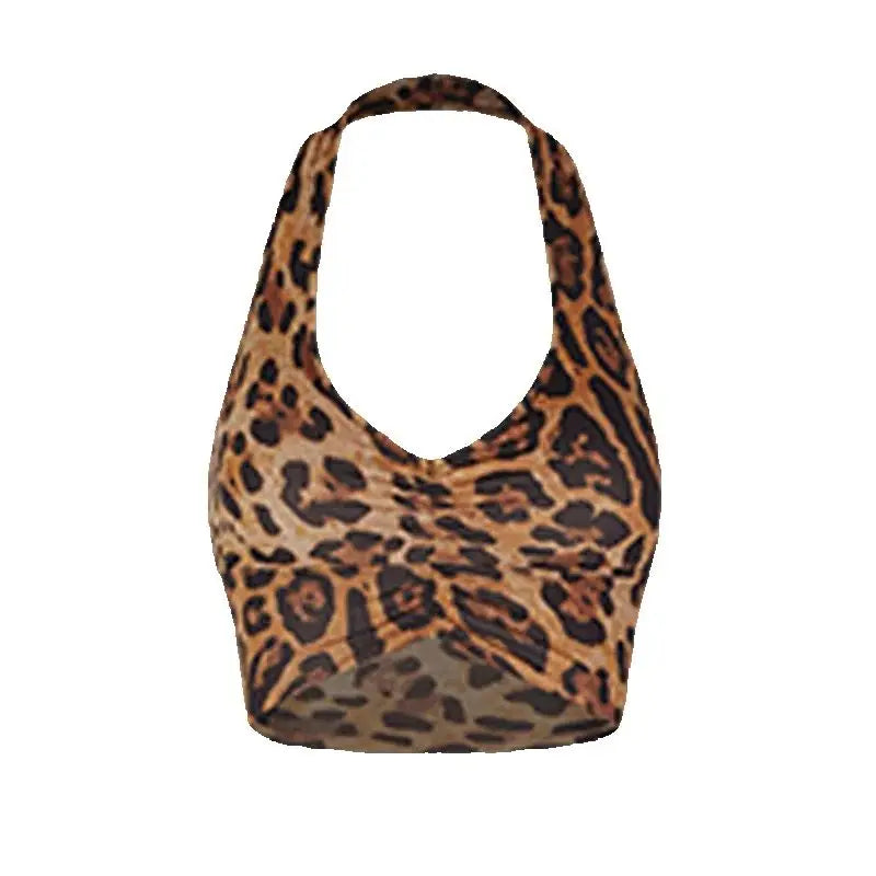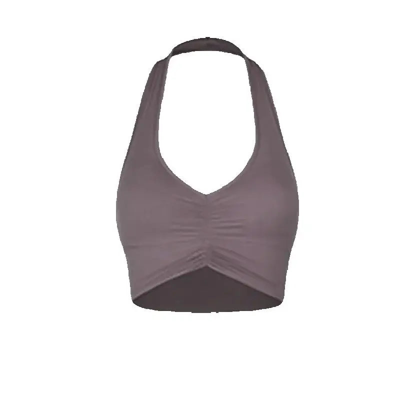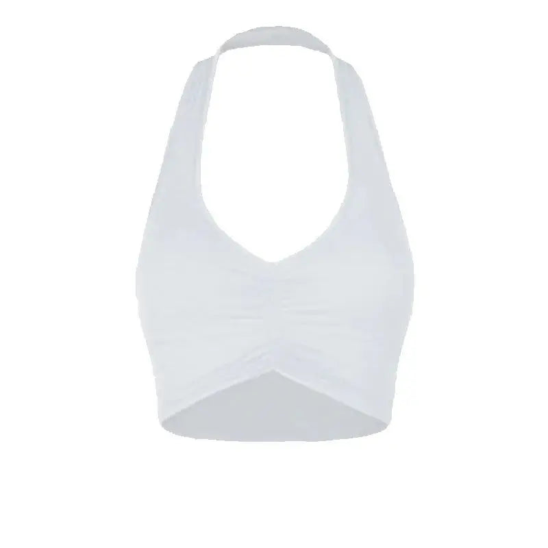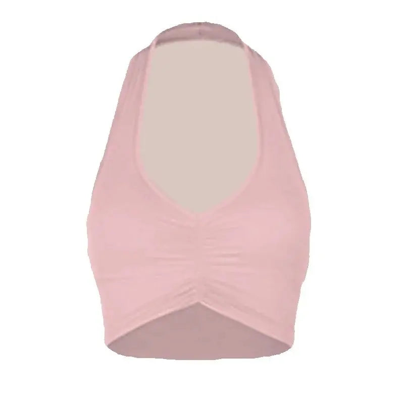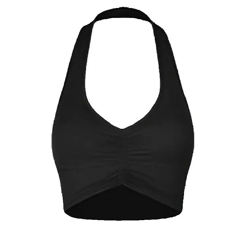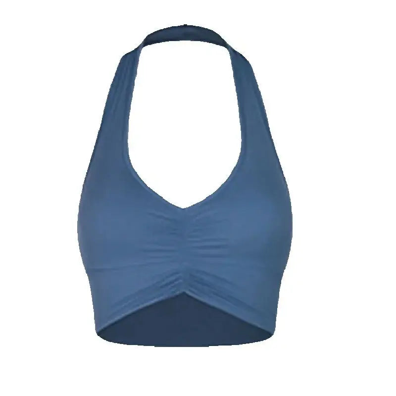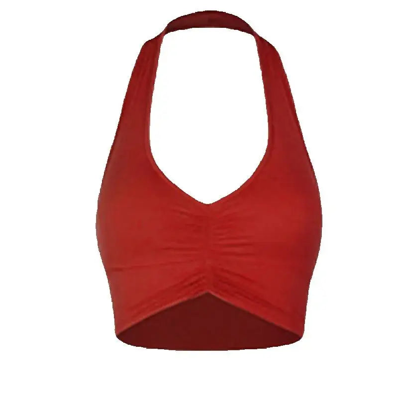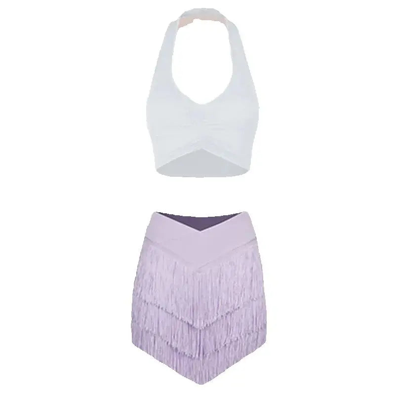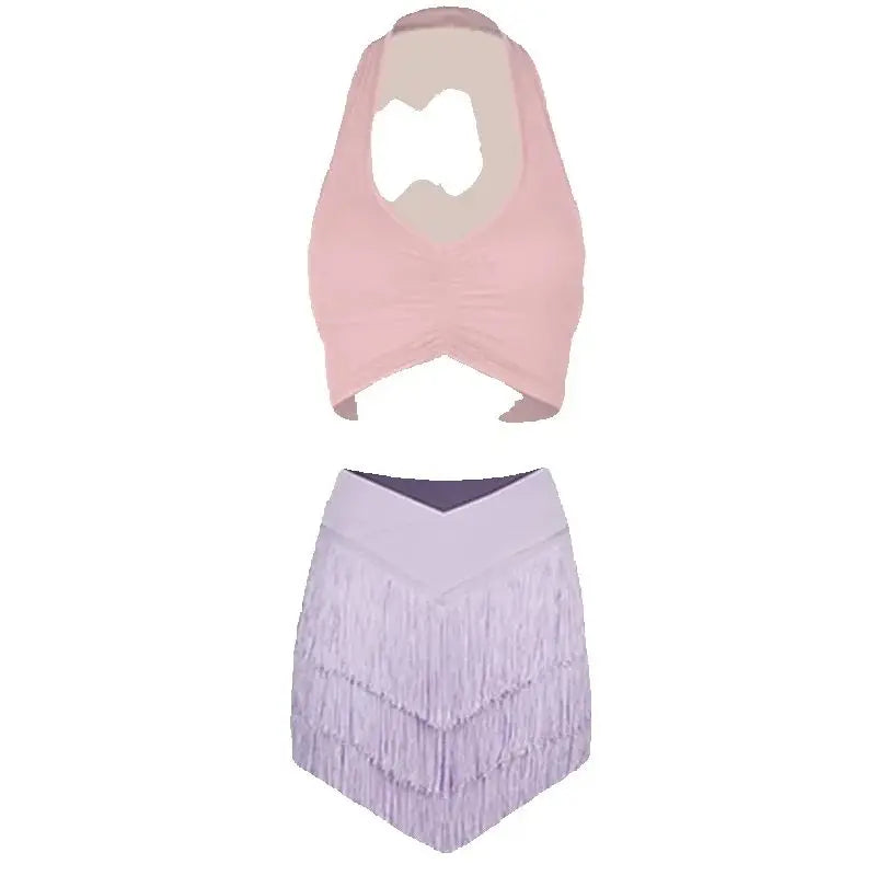 This women's Latin dance outfit features a halter neck ruched crop top and a layered fringe skirt, designed for elegant movement and style during performances. The set includes chest pads and is made with stretchy, comfortable materials ideal for dance, ensuring ease of motion and a flattering fit.