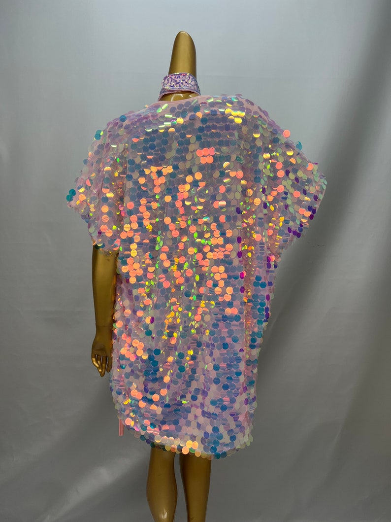 This women's iridescent sequin fringe set, including a halter top, skirt, and kimono, offers a captivating design perfect for belly dancing. The outfit features shimmering sequins and a comfortable, flexible fit ideal for performance wear.