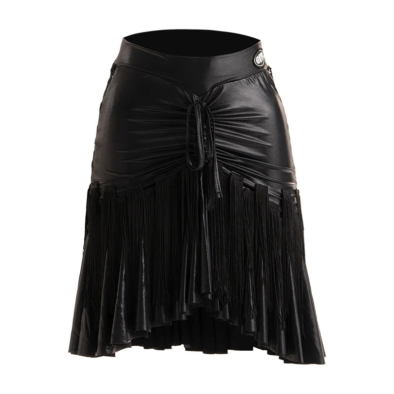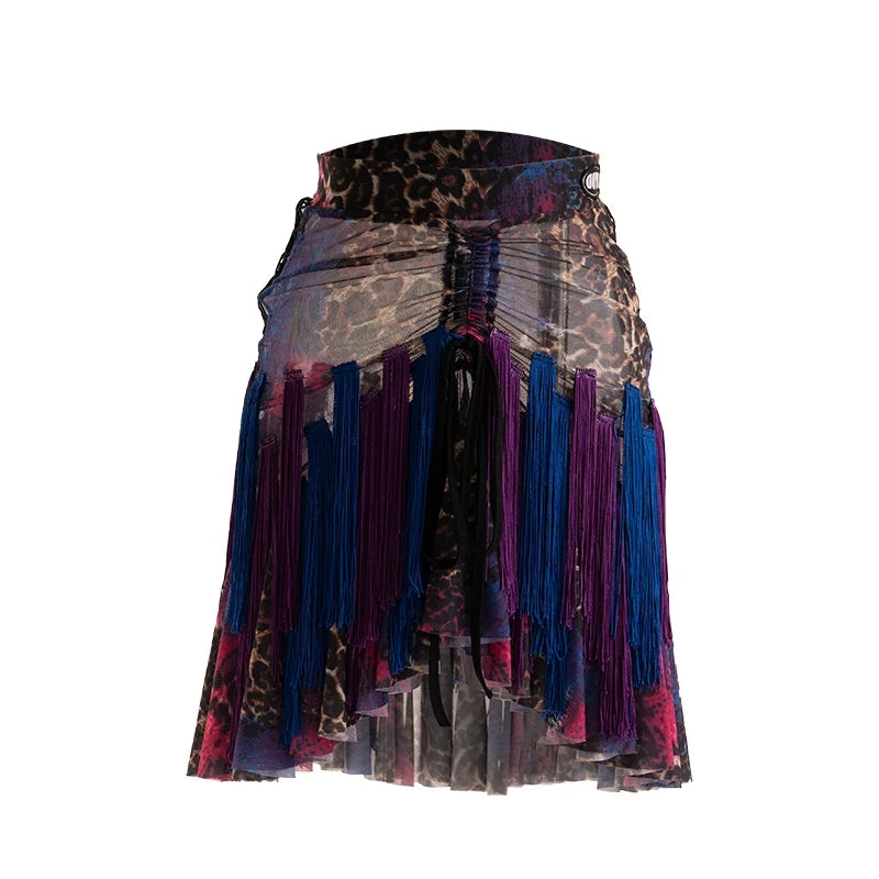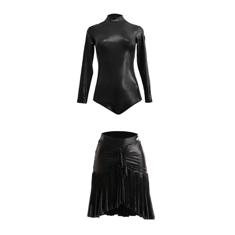 This women's leopard print mesh bodysuit with fringe skirt is perfect for Latin dancewear, featuring a stretchy and breathable material that allows for freedom of movement while maintaining a stylish and elegant fit.