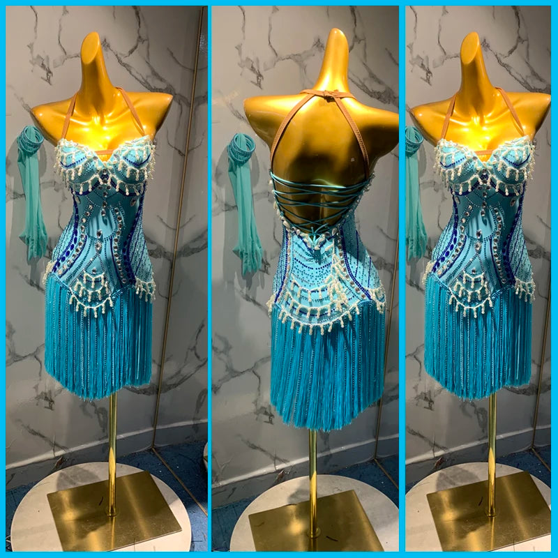 This light blue Latin dance dress features a beaded fringe design with a halter neck and open back, perfect for showcasing movement on the dance floor. Carefully handcrafted, each piece is unique with an emphasis on elegance and style, well-suited for professional dance competitions or vibrant social events.