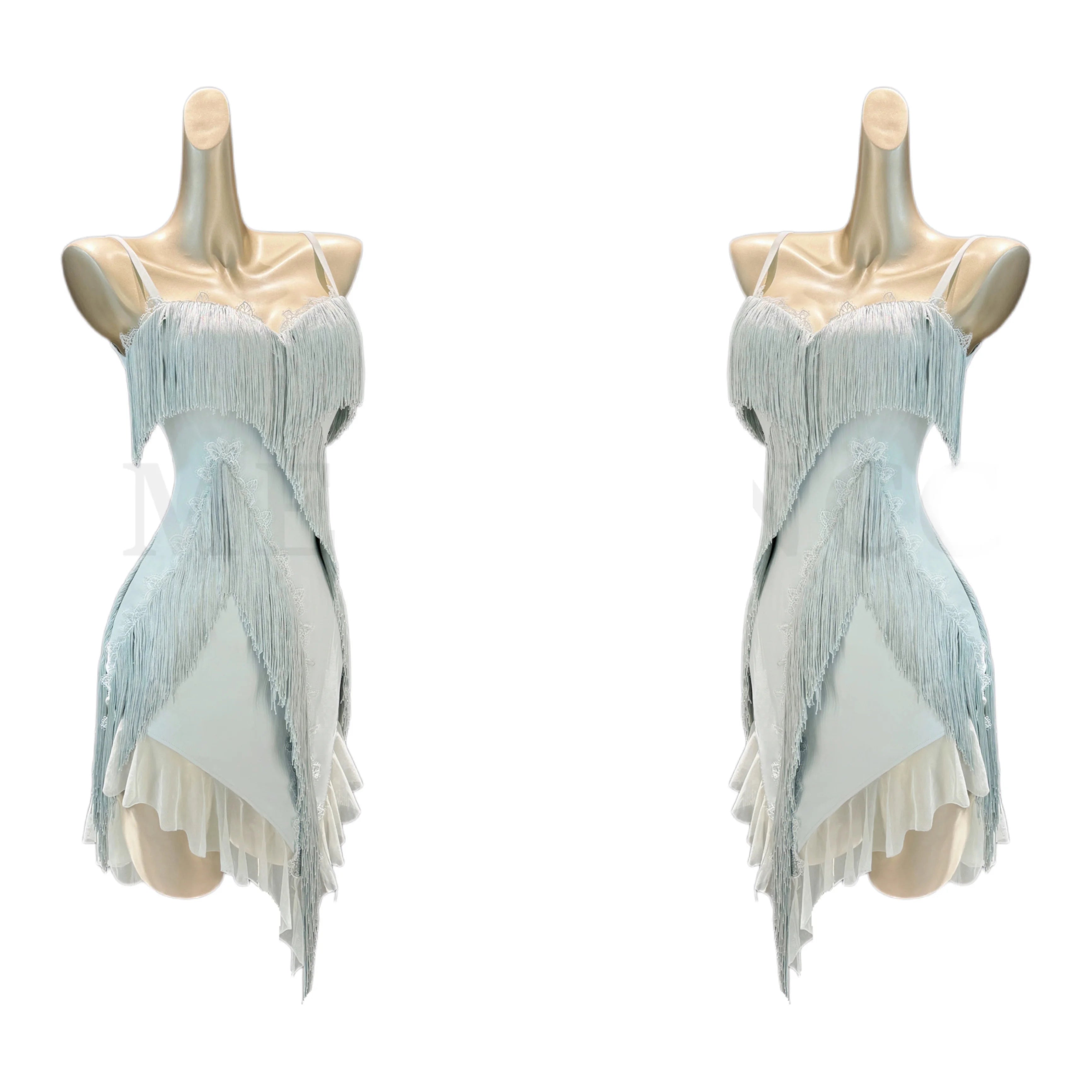 This Latin dance dress features a light blue and black asymmetrical hem with elegant fringe detailing, offering both style and flexibility for dynamic movement. Crafted from high-quality fabrics, it is perfect for performances or competitions, ensuring comfort and style with every step.