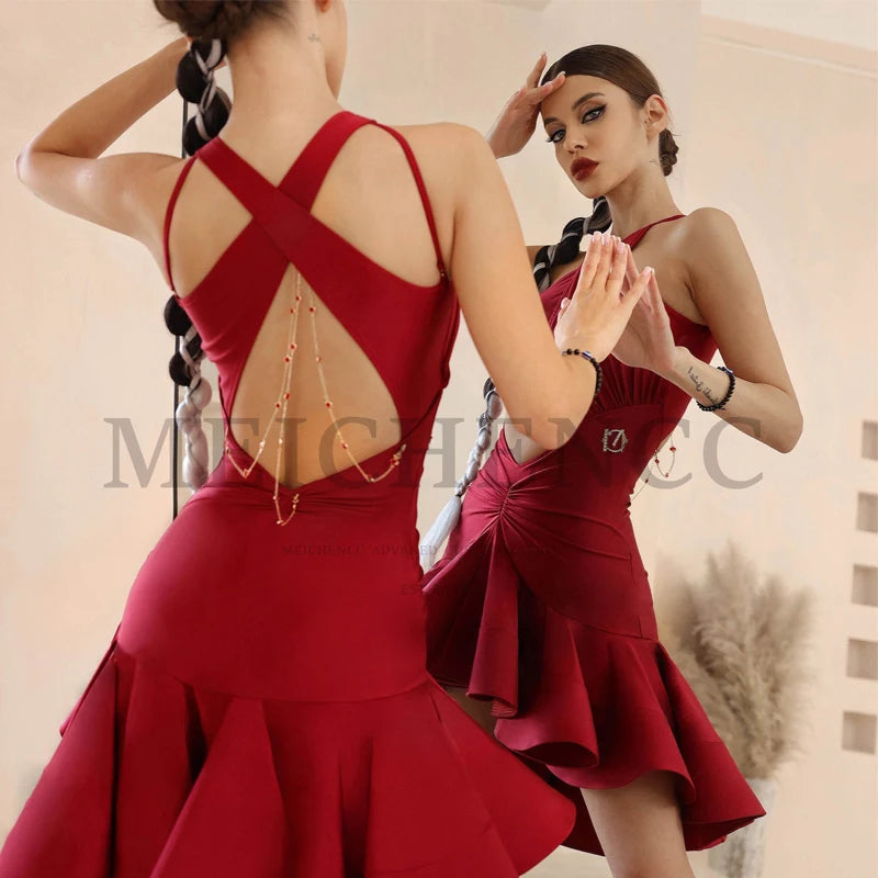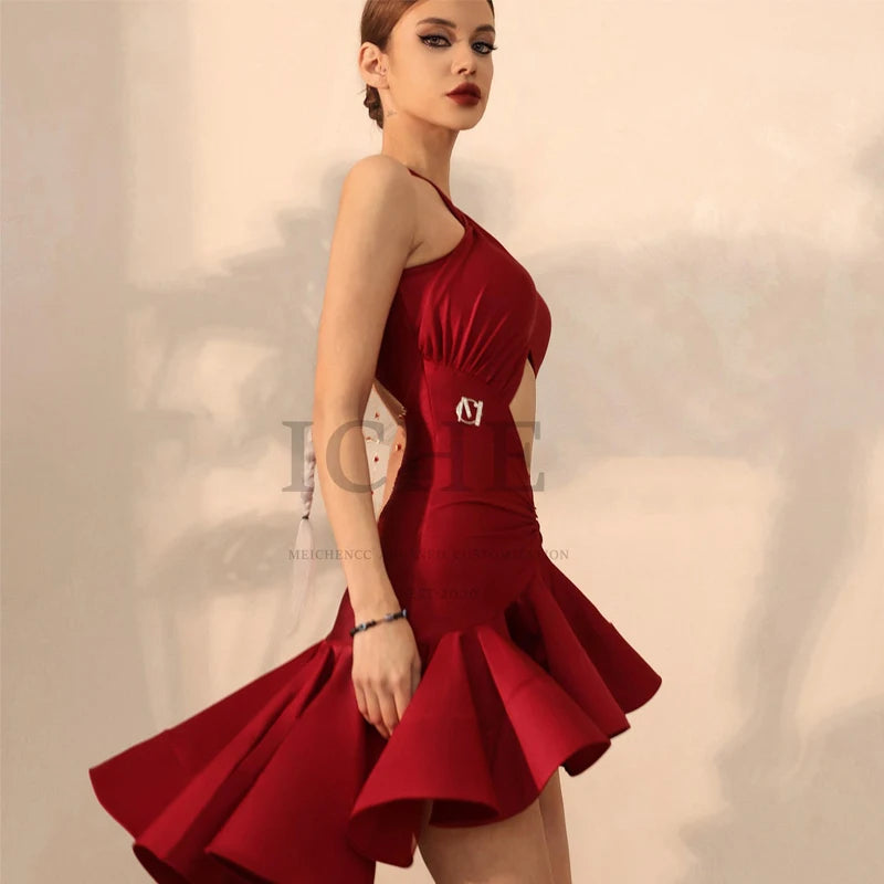 This light blue halter Latin dance dress features cutout and ruffled details, offering a stylish and dynamic look for performances. Made from a comfortable and stretchy fabric, it is designed for ease of movement and comes with gloves for a complete outfit.