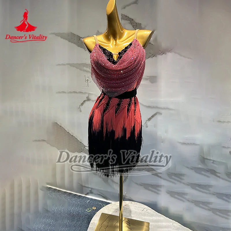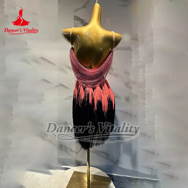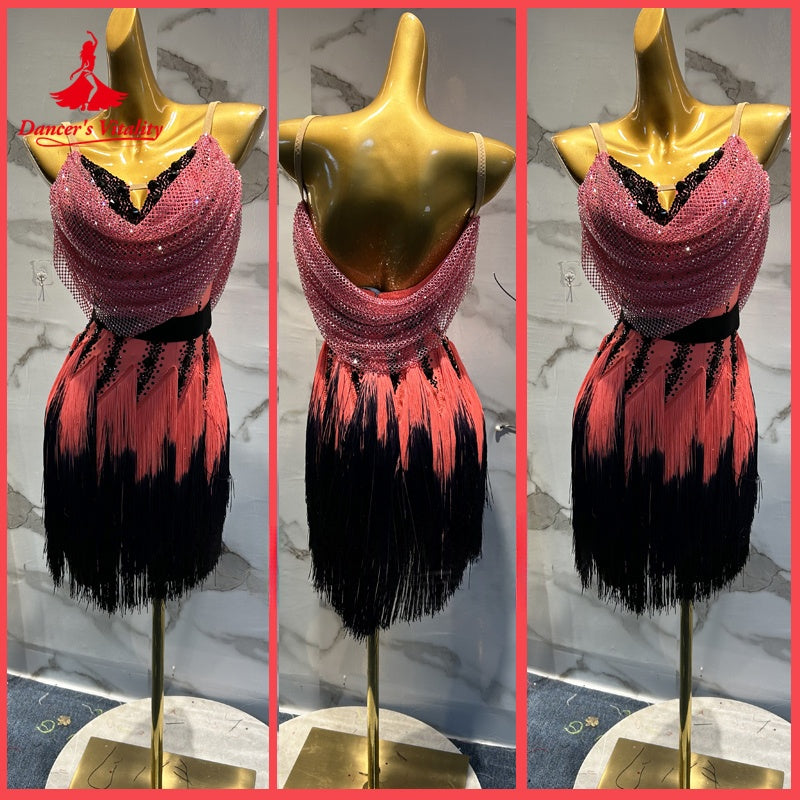 This stunning pink and black dance dress features sparkling sequins and playful fringe, perfect for adding flair to your Latin dance routines. Crafted with attention to detail, it offers a flattering fit and allows freedom of movement on the dance floor.