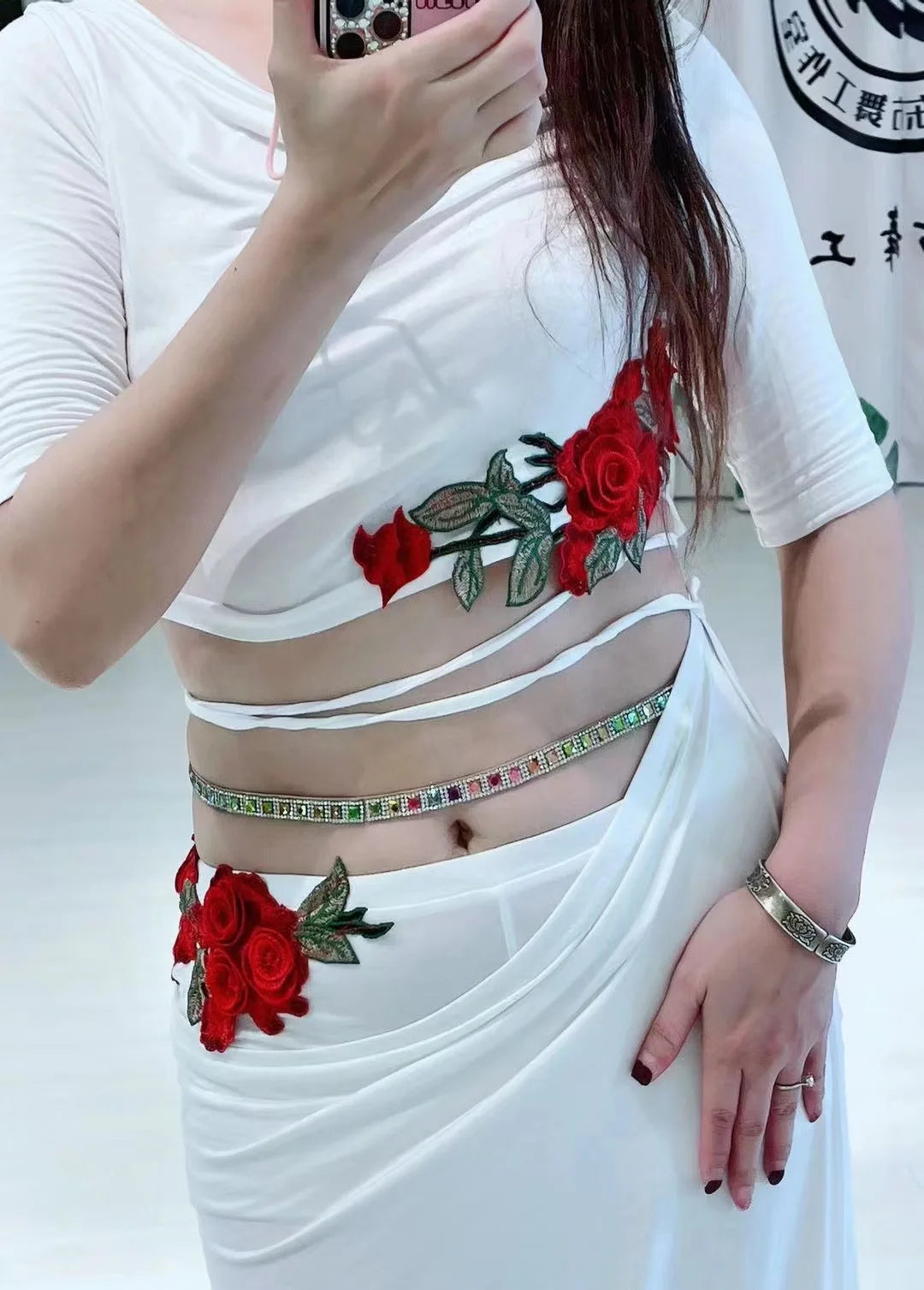 This elegant set features a pink floral applique draped crop top paired with a high slit skirt, perfect for belly dance performances. Made with lightweight, breathable fabric, it offers comfort and style, allowing free movement while maintaining an alluring appearance.