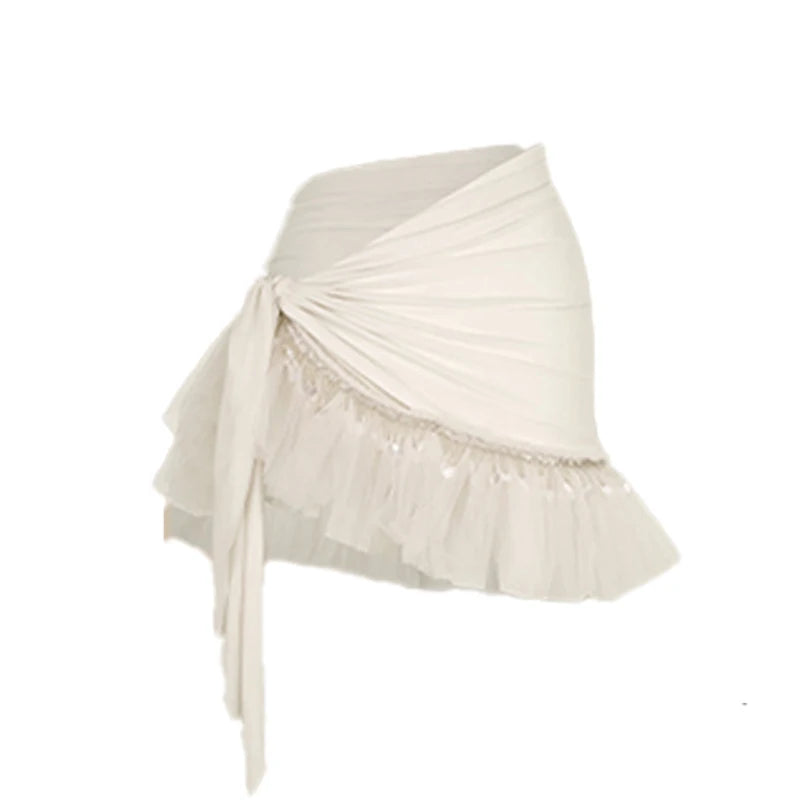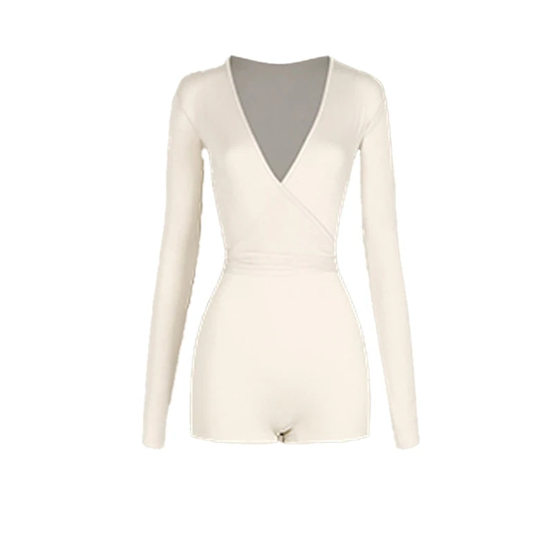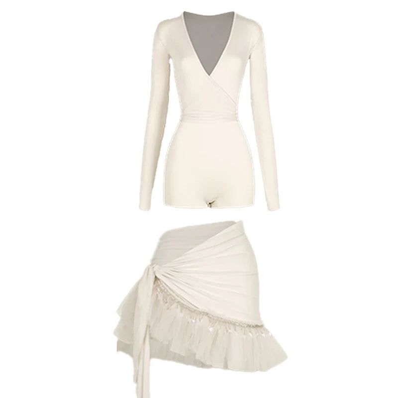 This pink V-neck bodysuit with a ruffled sequin wrap skirt is perfect for Latin dance performances, offering a snug fit to enhance your movements and a dazzling effect under the lights. It's made from stretchy materials for comfort and ease of movement, ensuring you're both stylish and comfortable on the dance floor.