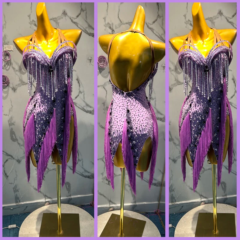 This purple beaded fringe Latin dance dress is meticulously hand-crafted, ensuring each piece is unique. Ideal for performances, it offers a flexible fit to accommodate movement and is made with attention to every detail, requiring proper measurements before production.