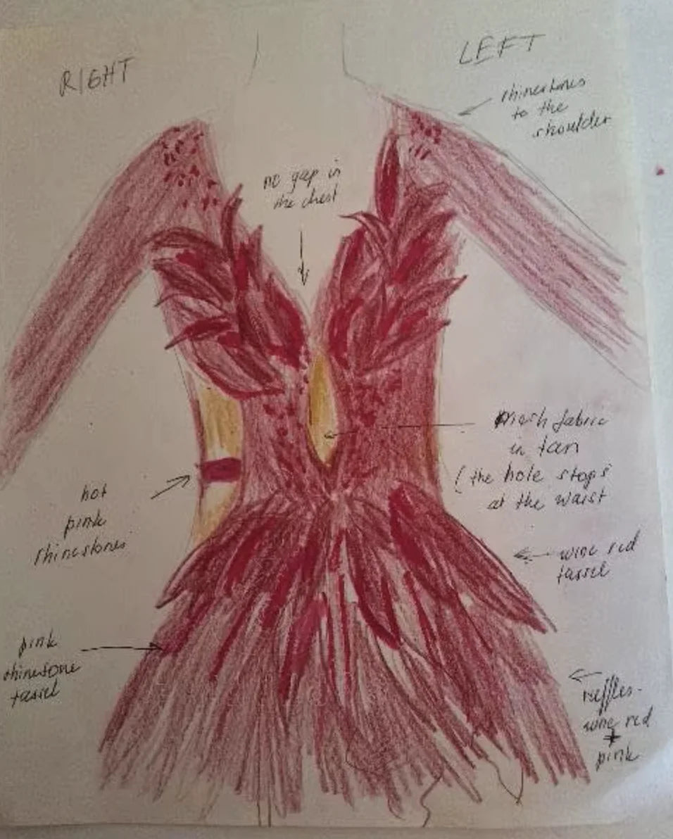 This elegant ballroom dance dress features intricate red and pink rhinestone embellishments and ruffled design, perfect for performance settings. Carefully handcrafted, each piece is unique and requires 10-15 days of production after payment confirmation.
