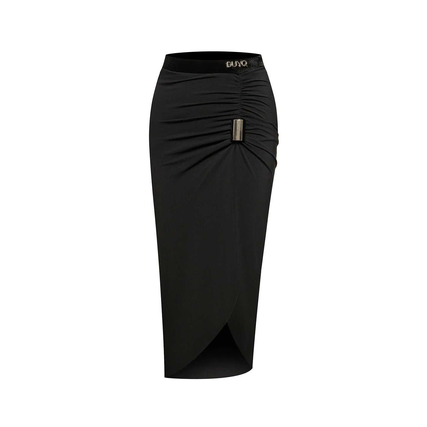 This women's Latin dance dress features an asymmetrical slit design in striking red and black, accented with a unique buckle detail. Made from stretchy, easy-care fabric, it's ideal for dance performances and provides a flattering, comfortable fit.