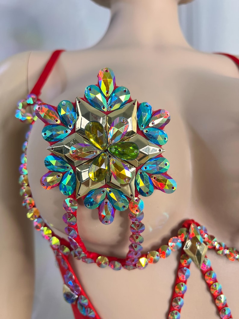 This stunning red bodysuit features rhinestone embellishments and seductive cut-outs, perfect for samba dance performances or making a bold statement. Its wire bra and thong ensure a flattering fit, and it comes with various size options to accommodate different body shapes.