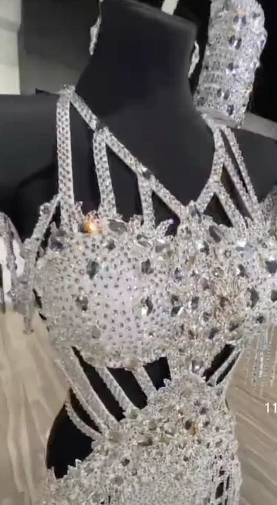 This women's silver sequin and fringe Latin dance dress features hand-made craftsmanship with cut-out details for a unique and glamorous look. Designed for dance performances, it offers flexibility and style, suitable for international buyers remembering potential customs fees and extended shipping times.