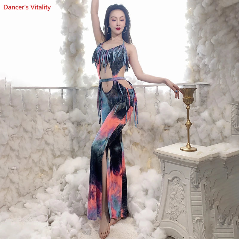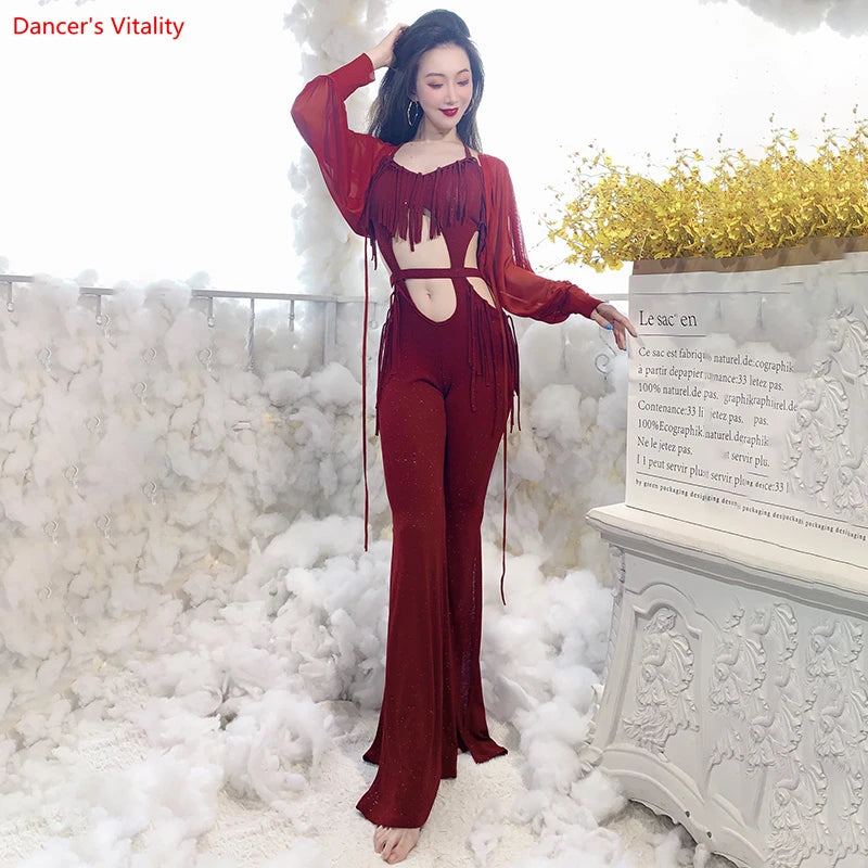 This vibrant yellow jumpsuit features playful fringe accents and daring cutouts, designed with sheer sleeves for an elegant look, ideal for belly dance performances or festive occasions. The fabric provides a comfortable fit while being easy to care for, ensuring it remains a staple in your wardrobe.