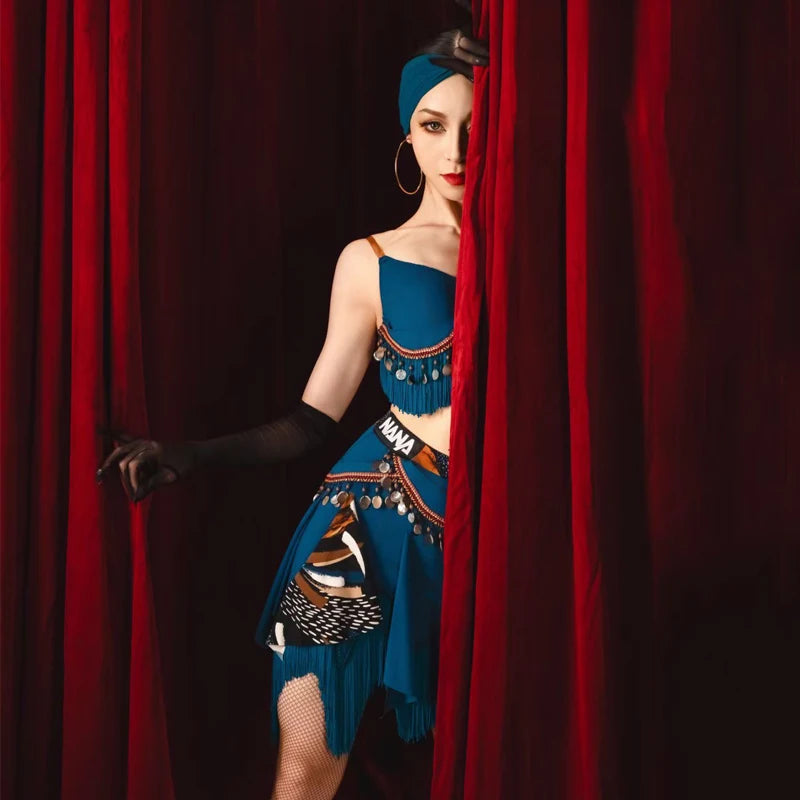 This belly dance costume set features a stunning blue fringe sequined design, perfect for captivating performances. With a comfortable fit and stretchy fabric, it allows freedom of movement, suitable for tribal fusion dance styles and easy care maintenance.