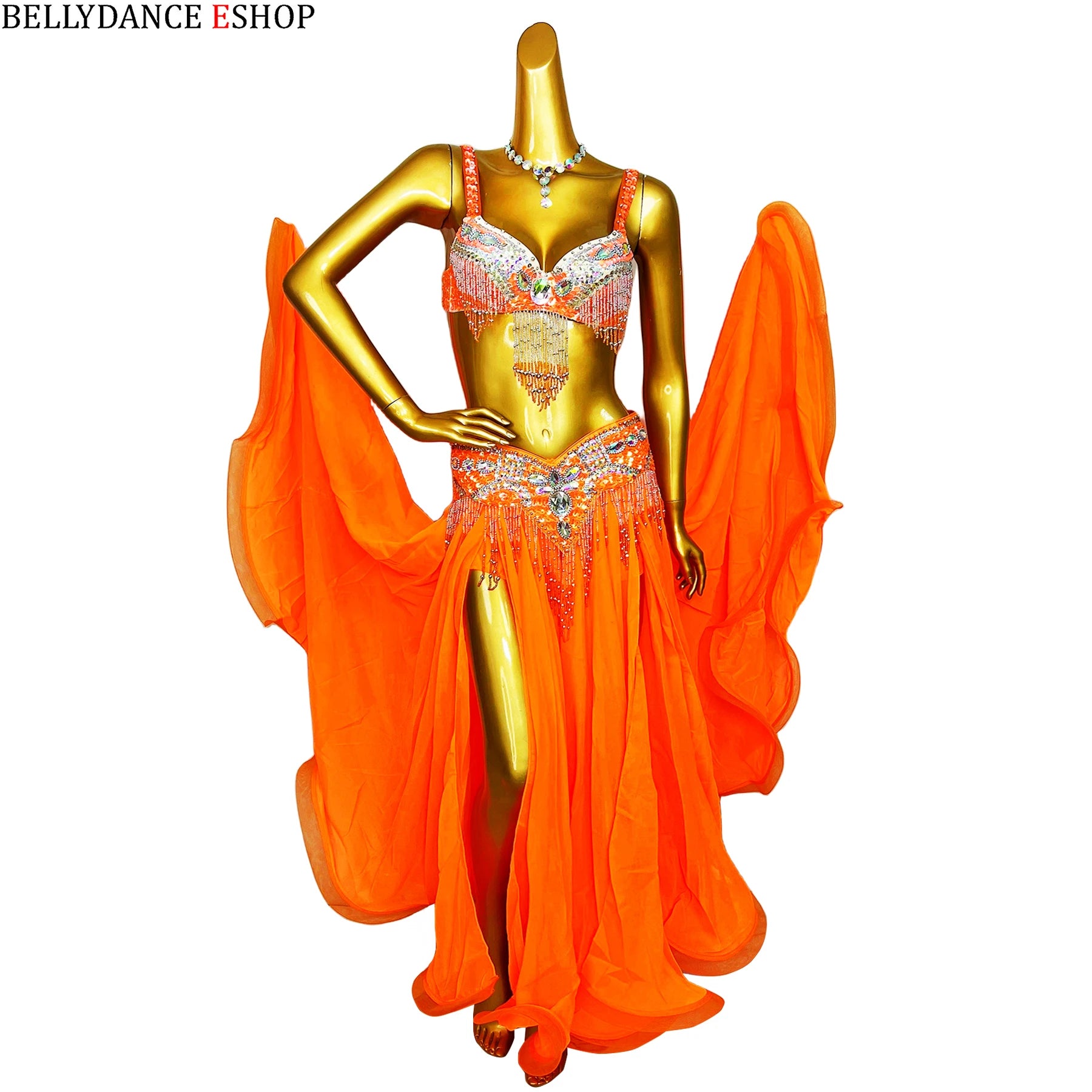 This belly dance costume set includes a beaded bra, belt, and slit skirt made from lightweight chiffon, perfect for stage performances. The fabric offers moderate stretch and easy maintenance, making it an excellent choice for dancers seeking comfort and style.