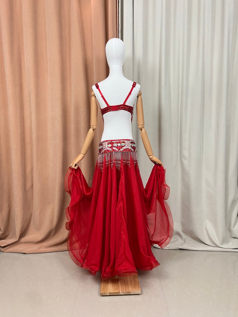 This belly dance costume set includes a beaded fringe bra, belt, and chiffon skirt, suitable for various waist sizes and customizable upon request, offering vibrant performance attire with a touch of elegance.