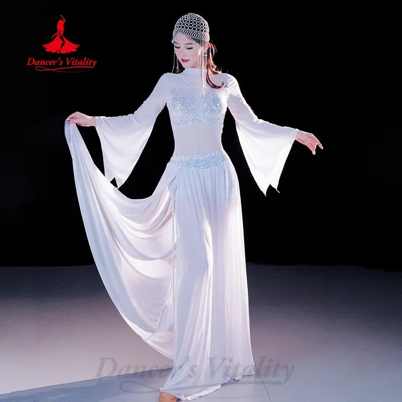 This elegant belly dance costume features a black sequin mesh top with long sleeves and a stylish slit skirt, perfect for capturing attention during performances. The stretchy fabric allows for ease of movement, while its lightweight nature makes it comfortable enough for prolonged wear.
